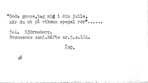 //// t //// i //// : //// "Goda gosse,tag mig i din julle, //// när du ut på vikens spegel ror"...... //// t //// 5:4. Björneborg. //// Svenssons saml.häfte nr.5.s.124. //// ! //// j //// ÅBO. //// <4 ////