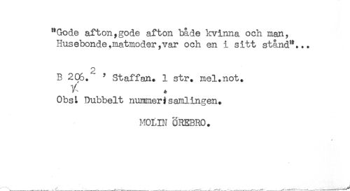 //// "Gode afton,gode afton både kvinna och man. //// Husebonde,matmoder,var och en i sitt stånd"... //// 2 //// B 205. ' ' Staffan. 1 str. mel.not. //// V //// Obst Dubbelt nummeri samlingen. //// MOLIN ÖREBRO. //// * ////
