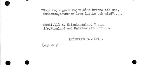//// "Gode mojon,gode mojon,både kvinna och man. //// Husbonde ^matmoder leve lustig och glad"..... //// Sdmld.3.3.2 a. Hälsningssång. 2 str. //// jfr.Forslund med Dalälven.11:3 nr.18. //// ANDERSSON SV. LÅT AR. ////