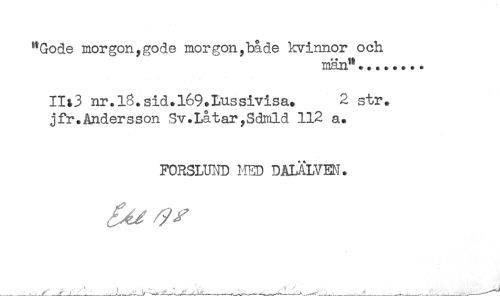 //// "Gode morgon,gode morgon,både kvinnor och //// ** tt //// man"... //// IIt3 nr.l8.sid.l69.Lussivisa. 2 str. //// jfr.Andersson Sv.Låtar,Sdmld 112 a. //// FORSLUND HED DALÄLVEN. ////