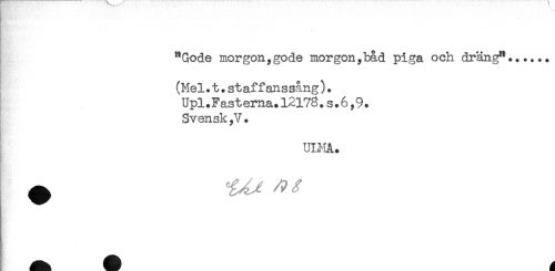 //// "Gode morgon,gode morgon,bad piga och dräng"...... //// (Hel. t.staffanssång). //// Upl.Fasterna.12178.s.6,9. //// Svensk ,V. //// UIMA. ////