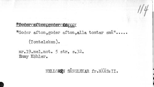 //// "Göder afton,göder afton,alla tomtar små"..... //// (Tomteleken). //// nr.19.mel.not. 5 str. s.32. //// Emmy Kohler. //// HELLGB^T SÅNGLEKAR fr.NnS:II. ^ //// t ////