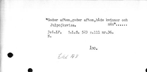 //// "Göder afton,göder afton,både kvinnor och //// Julpo jksvisa. ...... //// 3:6.LF. 3.L.S. 523 s.lll nr.36. //// N. //// ÅBO. ////