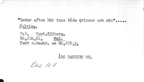 //// - //// "Göder afton här inne både qvinnor och män",.... //// Julvisa. //// 7:2. Uppt.Sjöberg. //// R6,204,64? Mel._ //// Text o.beskr. se R6.20$,b. ! //// I //// ÅBO RANCKB-i MS. ////