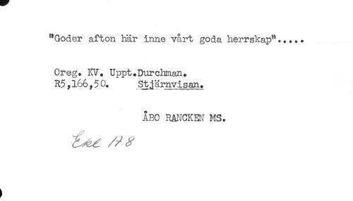 //// "Göder afton här inne vårt goda herrskap"..... //// Oreg. KV. Uppt.Durchman. //// R5,166,5 0. Stjärnvisan. //// ÅBO RANCKEN MS. ////