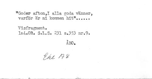 //// "Göder afton,1 alla goda vänner, //// varför är ni kommen hit"...... //// Visfragment. //// 1:4.0R. S.I..S. 231 s.353 nr.9. //// ÅBO. ////