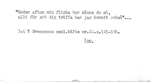 //// "Göder afton min flicka hur månne du må, //// allt för att dig träffa har jag kommit också"... //// 3:4 ? Svenssons saml.häfte nr.2A.s.lC5-106. //// ÅBO. ////