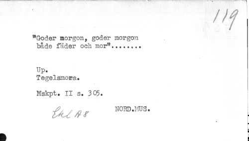 //// "Göder morgon, göder morgon //// både fäder och mor"... //// Up. //// Tegelsmora. //// Mskpt. II s. 3 05. //// r //// * //// H //// ] ////