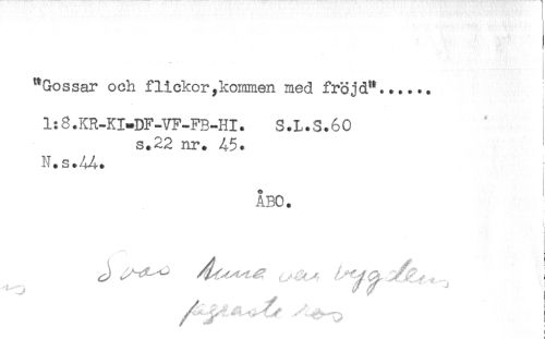 //// "Gossar och flickor ^kommen med fröjd"...... //// i //// 1:8. KR-KI*DF-VF-FR-HI. S. L. S. 6 0 //// s.22 nr. 45. //// N.s.44. //// ÅBO. //// i //// J ^^ ^y^ ^ I ////