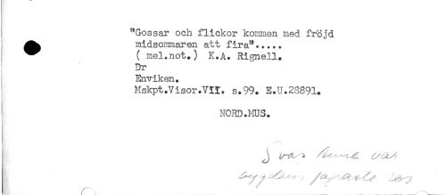 //// "Gossar och flickor kommen med fröjd //// ^^ midsommaren att fira"..... //// ! ^ ( mel.not.) K.A. Rignell. //// Dr //// Enviken. //// : Mskpt.Visor.VII. s.99. E.U.28891. //// NORD.HUS. //// { //// - ////