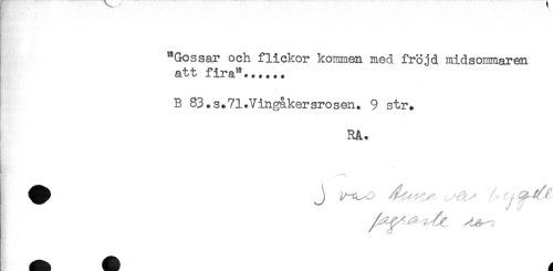 //// "Gossar och flickor kommen med fröjd midsommaren //// att fira"...... //// B 83.s.71.Vingåkersrosen. 9 str. //// RA. //// ^ J ^tuo ^ - v , ////