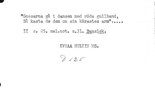 //// ) //// - //// I //// "Gossarna ga i dansen med roda gullband. //// Så kasta de dem om sin kärastes arm"..,.. //// i //// II s. 2$. mel.not. s.31. Danslek. //// KVHAA HULT IN MS. //// 9 ^ .a ^ //// ) ////