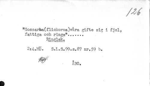 //// "Gossarha(f li ekorna )våra gifte sig i fjol, //// fattiga och ringa"....... //// Ringlek. //// S.L.S.99.S.87 nr.59 b. //// ABO. ////