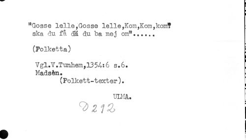//// "Gosse lelle,Gosse lelleyKom,Komykom? //// ska du få dä du ba mej om"....,. //// (Polketta) //// Vgl.V.Tunhemyl354:6 s.6. ! //// Madsén. ; //// (Polkett-texter). //// UDIA. ////