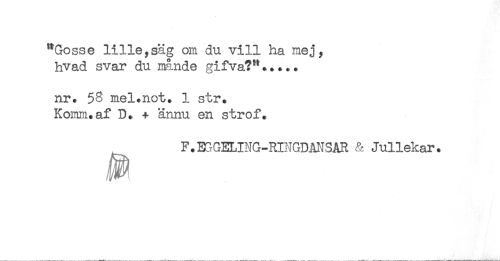 //// "Gosse lille,säg om du vill ha mej, //// hvad svar du månde gifva?"..... //// nr. 58 mel.not. 1 str. //// Komm.af D. + ännu en strof. //// F.mGELING-RINGDANSAR & Jullekar. ////