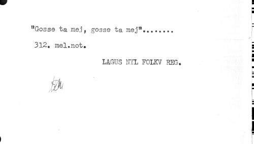 //// ! //// "Gosse ta mej, gosse ta mej",....... T //// } //// t //// 312. mel.not. g //// E //// i //// LÅGUS MYL FOLKV REG. ' //// # = //// ! //// ! //// t ////