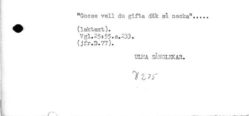 //// { "Gosse vell du gifta däk så necka"..... //// ^^ (lektext). //// Vgl.25:55.s.233. //// (jfr.D.77). //// UIMA SÅNGLEKAR. //// t //// . //// h^j. f . . . . . ___^ ////