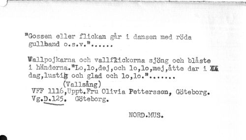 //// "Gossen eller flickan går i dansen med röda //// gullband o.s.v. //// Vallpojkarna och vallflickorna sjöng och blåste //// i händerna.*L0yl0ydej,0ch lOylOymejyåtte dar i2E& //// dag,lustig och glad och lo,lo. //// (Vallsång) //// VFF lll6yUppt.Fru Olivia Pettersson. Göteborg. //// Vg.D^125. Göteborg. //// NORD.MUS. ////