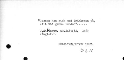 //// "Gossen han gick ned träskorna på, //// allt uti gröna lunden"...... //// Ö,SaMerup. Sk.2^35:32. 216? //// ringlekar. //// ^ FCIKLIVSÅRKIVET URID. ////