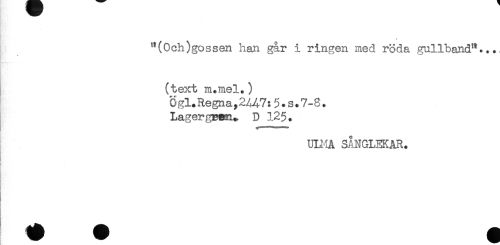 //// "(Och)gossen han går i ringen med röda gullband"..., //// (text m.mel.) //// Ögl.Regna,2/47:5.s.7-8. //// LagergBRn^ D 125. //// ULHA SÅNGLEKAR. //// B //// ti ////