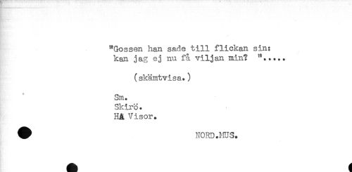 //// } //// - //// "Gossen han sade till flickan sin: //// kan jag ej nu få viljan min? "..... //// (skämtvisa.) //// Sm. //// Skirö. //// HA Visor. //// ^ NORD.MUS. //// . //// * //// ^h g ////