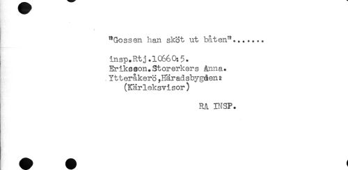 //// - //// "Gossen han sköt ut båten"....... //// insp.Rtj.10S6 0:5. //// Erikeson.Storerkers ånna. //// .YtteråkerÖ,Häradsbygåem //// (Kärleksvisor) //// RA INSP. ////