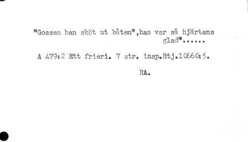 //// "Gossen han sköt ut båten",han var så hjärtans //// glad"...... //// A 479:2 Ett frieri. 7 str. insp.Rtj.lC660:5. //// RA. ////