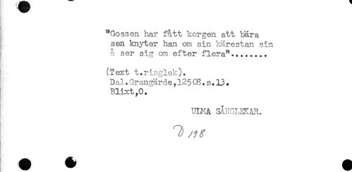 //// "Gossen har fått korgen att "knra //// sen knyter han om sin kärestan sin //// H å ser sig om efter flera"... //// (Text t.ringlek). //// Dal.Grangärde ?125 C8.s * 13. //// Blixt,0. //// ULKA SÅNGLEKAR. //// ** ////