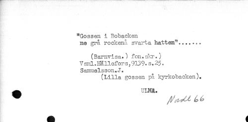//// - //// * -i* - .. .... //// "Gossen i Bobacken //// me grå rockenå svarta hatten'*... //// (Barnvisa.fon.skr.) //// V sml. Hä llef or s, 9T3 9. s. 2$. //// Samuelsson.J. //// (Lilla gossen på kyrkobacken). //// ^ ULH&. ////