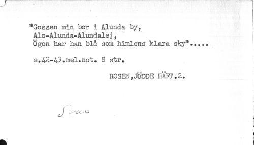 //// < //// "Gossen min bor i Alunda by, //// Alo-Alunda-Alundalej, , //// Ögon har han blå som himlens klara sky"..... //// s.42-43.mel.not. 8 str. //// ROSB^JSDDE HAFT.2. //// t- //// J ////