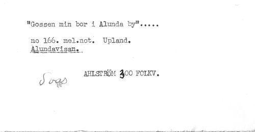 //// "Gossen min bor i Alunda by"..... //// no 166. mel.not. Upland. //// Älundavisan. //// t-f-racs* -"-..i-.' . ^v^iwi //// ^ AHLSTR&M ^CC FOLKV. ////