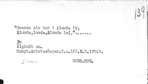 //// "Gossen min bor i Alunda by, //// Alunda,lunda,Alunda lej //// Xlghult sn. //// Mskpt.Arbet s sånger.I.s.182.E.U.19549. //// NORD.MUS. ////