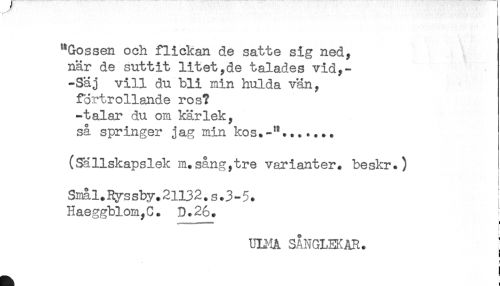//// "Gossen och flickan de satte sig ned, //// när de suttit litet,de talades vid,- //// -Sä j vill du bli min hulda vän, //// fortrollande ros? //// -talar du om kärlek, //// Q ^ //// sa springer jag min kos... //// (Sällskapslek m.sång,tre varianter, beskr.) //// . //// Smål.Ryssby*2ll32.s.3-5. //// Haeggblom,C. D.26. //// . ...... ' //// ) //// ULMA SÅNGLEKAR. j //// t. //// ^ ! ////
