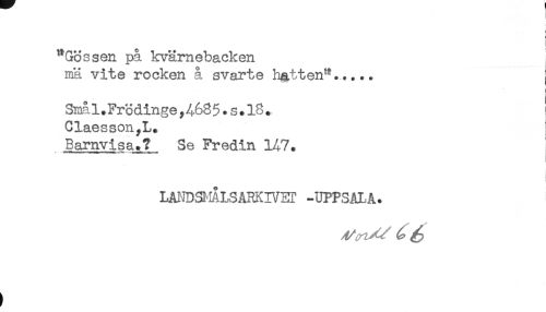 //// "Gossen på kvarnebacken //// mä vite rocken å svarte hatten^..... //// Sma. 1. Frödinge,468 5. s. 18; //// Claesson,L. //// Barnvisa.? Se Fredin 147. //// ......t* « **I ......t***a*.a<:aM*-!* //// I //// i //// LAI-jDSIÅLSARKIVET -UPPSAIA. ////