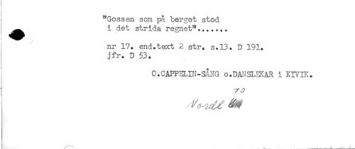 //// "Gossen som på berget stod //// t ^^ i det strida regnet"....... //// nr 17. end.text 2 str. s.13. D 191. //// jfr. D 53. //// 0.CAPP3LIN-SÅNG o. DANSLEK AR i KWIK. //// . ____ ////