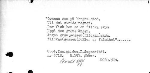//// "Gossen som på berget stod, //// Uti det strida regnet. //// Der fick han se en flicka skön //// Uppå den gröna ängen. //// Ängen grön,gossen(flickan)skön. //// flickan(gossen)fuller av falskhet"....... //// ^^ Uppt. Ins . gm. doc .T. Seger stedt. //// nr 5718. D.191. Skåne. //// ^^^ NORD .ms. ////