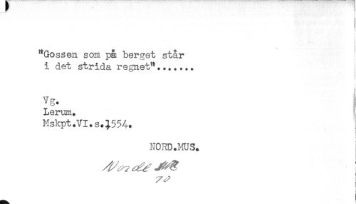 //// ! //// f //// "Gossen som på berget står //// i det strida, regnet"....... //// Vg. i //// Lerum. //// Mskpt.VI.s.;55Å. //// < //// NOHD.MUS. ////