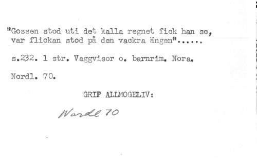 //// "Gossen stod uti det kalla regnet fick han se, //// var flickan stod pa den vackra ängen"......; //// s+232. 1 str. Vaggvisor o. bamrim. Nora. ! //// i //// Nordl. 70. ; //// GRIP ALLMOGELIV: ////
