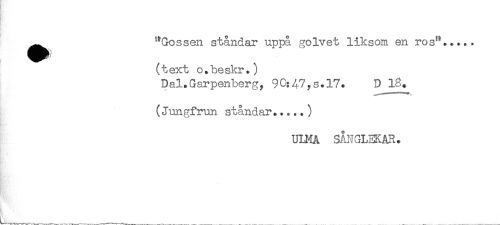 //// ^^ "Gossen ståndar uppå golvet liksom en ros^..... //// (text o.heskr.) //// Dal.Garpenberg, 9C:47yS.17. D 18. //// (Jungfrun ståndar.....) //// ULMA SÅNGLEKAR. ////