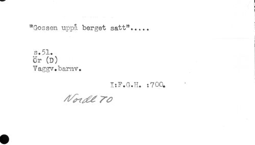 //// ' - -..... //// < //// - //// "Gossen uppå berget satt"..... //// s.51. //// Cr (D) //// Vaggv.barnv. //// i //// I:F.G.H. :700. ////