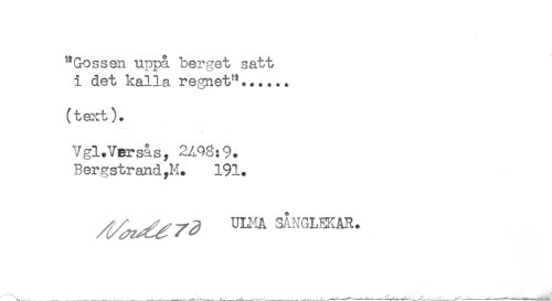 //// "Gossen uppå berget satt //// i det kalla regnet'*....., //// (text). //// VgltVersås, 2498:9. //// BergstrandyM. 191. //// ^ ULMA SANGLEKAR. ////
