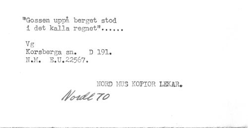 //// "Gossen uppå berget stod //// i det kalla regnet"...... //// Vg //// Korsberga sn. D 191. //// N.M. E.U.22567. //// NORD MUS KOPIOR LEKAR. //// ,4' ////