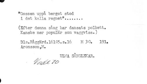 //// "Gossen uppå berget stod //// i det kalla regnet"... //// (Efter denna sång har dansats polkett. //// Kanske mer populär som vaggvisa.) //// Dls.Råggärd.l6l05.s.l6 M 30. 191. //// Aronsson,M. //// ULMA SÅNGLEKAR. ////