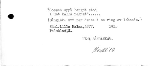 //// "Gossen uppå berget stod //// ^^ i det kalla regnet^,..... //// (Sånglek. Ett par dansa i en ring av lekande.) //// Sdml.Lilla Malma,A877. 191. //// Parblad, //// ULMÅ SÅNGLEKAR. //// ^ ////