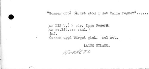 //// "Gossen uppå barget stod i det kalla regnet".,.... //// nr 313 b,) 2 str. Inga Degerä. //// (ur sv.lit*s:s saml.) //// jmf. //// Gossen uppå bärget gick. mel not* //// LAGUS NYLAND. //// ___ - ..... ////