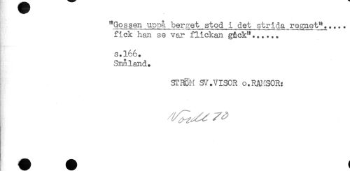 //// "Gossen uppå berpret stod i det strida regnet"..... //// fick han se var flickan gick"...... //// . //// s.166. //// Småland. //// STHgM SV .VISOR o.RAMSOR: //// - ////