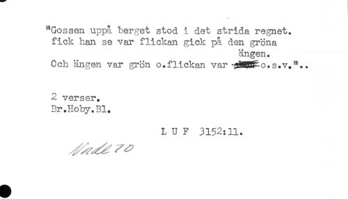 //// + //// "Gossen uppå berget stod i det strida regnet, //// fick han se var flickan gick på den gröna //// ängen. //// Och ängen var grön o.flickan var *$H!E&o.s.v.".. //// 2 verser. //// Br.Hoby.Bl. //// LUF 3152:11. ////