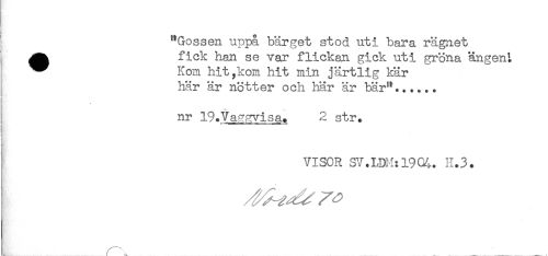 //// - "Gossen uppå bärget stod uti bara rägnet //// ^^ fick han se var flickan gick uti gröna ängent //// ^ Kom hitykom hit min järtlig kär //// här är nötter och här är bär"...... //// nr 19.Vaggvisa. 2 str. //// VISOR SV.IDM:19C4. H.3. //// - ////