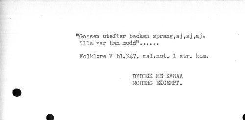 //// -- //// "Gossen utefter backen sprang,ajyajyaj. //// illa var han modd"...... //// Folklore V bl.347. mel.not. 1 str. kom. //// f" //// DYBECK MS KVHAA //// MOBERG EXCERPT. ////