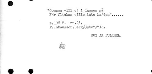 //// "Gossen vill ej i dansen gå //// For flickan ville inte ha'den"...... //// s.193 V. nr.23. //// P.Johansson.Berg.Sstergtld. //// ' HUS AK FOLKMEL. ////